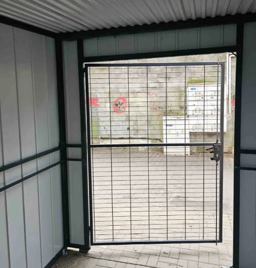 Wiata śmietnikowa MOD 3,6m x 4,5m, wysokość 2,20 m od strony bramy - 2,00 m z tyłu wiaty.