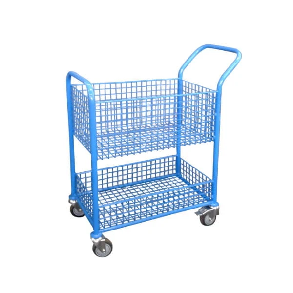 Funkcjonalny wózek gospodarczy z charakterystycznym osiatkowaniem, który idealnie nadaje się do przewozu mniejszych ładunków luzem oraz w opakowaniach.