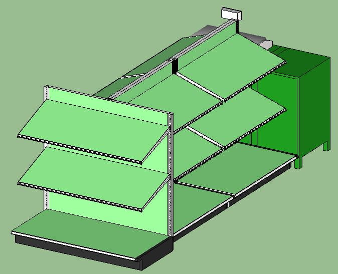Wyspa na warzywa i owoce na bazie regału typu gondola o wysokości 130-140 cm, szerokości 1,2m i długości łącznie ok 3,2 mb.