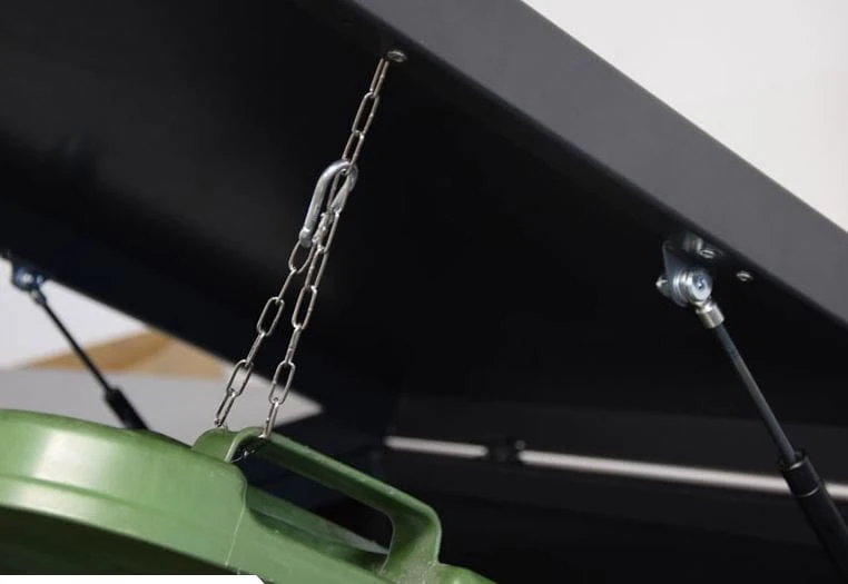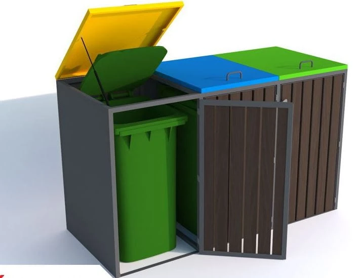 Zabudowa pojemników do segregacji odpadów składająca się z 3 komór 3x240 litrów. Istnieje możliwość rozbudowy o kolejne komory.