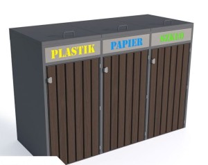 Zabudowa pojemników do segregacji odpadów składająca się z 3 komór. Istnieje możliwość rozbudowy o kolejne komory.