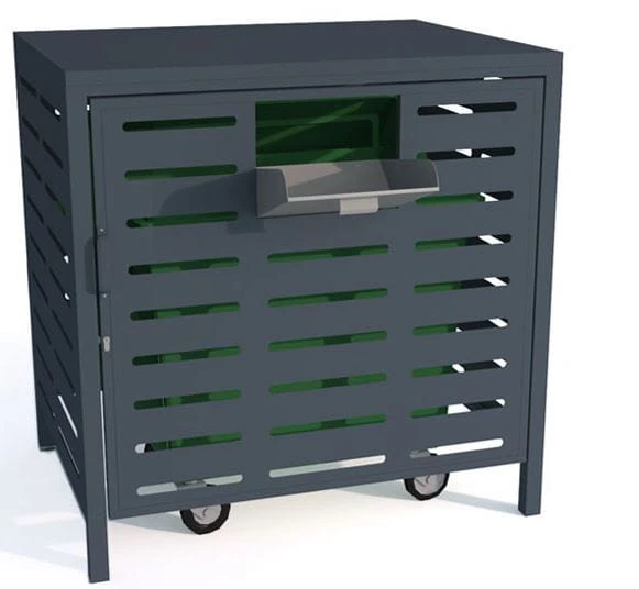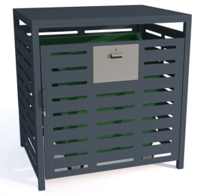 Zabudowa kontenera na śmieci VII/ 1100 l, uniwersalna, pasuje do pojemników do maksymalnej pojemności 1100l. Wyposażona w zsyp na śmieci. Mocowanie poprzez przykręcenie lub wbetonowanie.